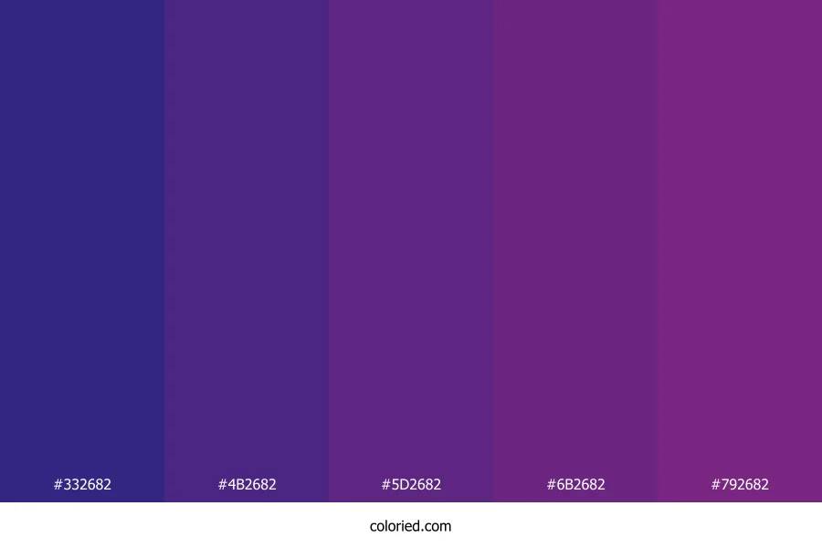 ![]() | #332682 | 51, 38, 130 | 248, 55%, 33% | 61%, 71%, 0%, 49% | oklch(0.348 0.147 282) |