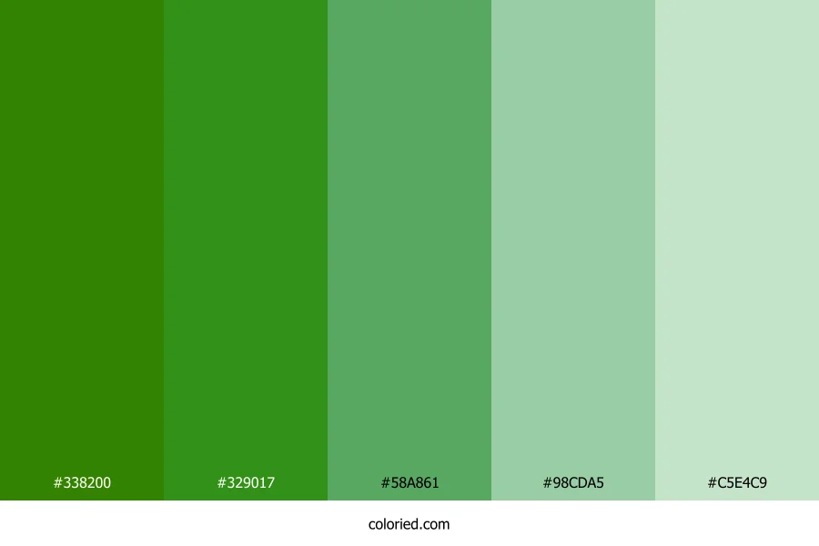![]() | #338200 | 51, 130, 0 | 96, 100%, 25% | 61%, 0%, 100%, 49% | oklch(0.536 0.166 138) |