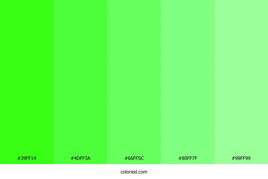 ![]() | #39FF14 | 57, 255, 20 | 111, 100%, 54% | 78%, 0%, 92%, 0% | oklch(0.871 0.286 142) |