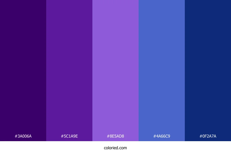 | #5C1A9E | 92, 26, 158 | 270, 72%, 36% | 42%, 84%, 0%, 38% | oklch(0.405 0.192 300) | |