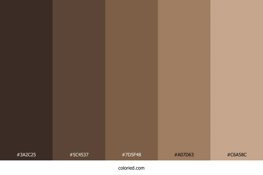 | #5C4537 | 92, 69, 55 | 23, 25%, 29% | 0%, 25%, 40%, 64% | oklch(0.411 0.039 53) | |