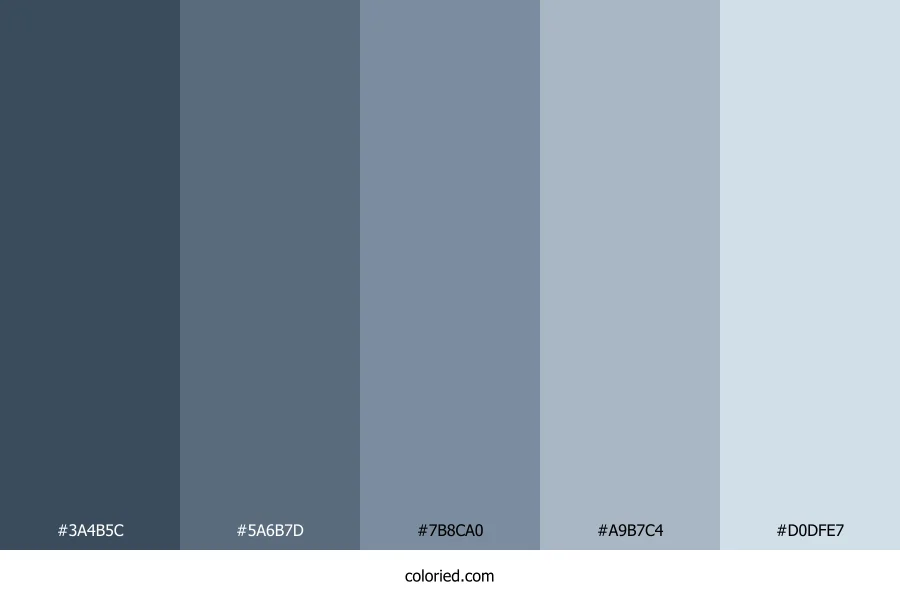 ![]() | #3A4B5C | 58, 75, 92 | 210, 23%, 29% | 37%, 18%, 0%, 64% | oklch(0.405 0.036 249) |
