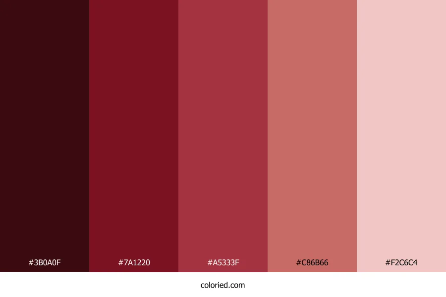 ![]() | #3B0A0F | 59, 10, 15 | 354, 71%, 14% | 0%, 83%, 75%, 77% | oklch(0.237 0.076 20) |