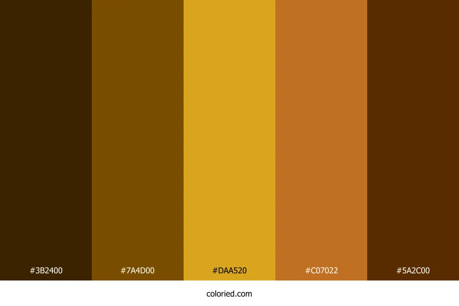 | #7A4D00 | 122, 77, 0 | 38, 100%, 24% | 0%, 37%, 100%, 52% | oklch(0.460 0.099 71) | |