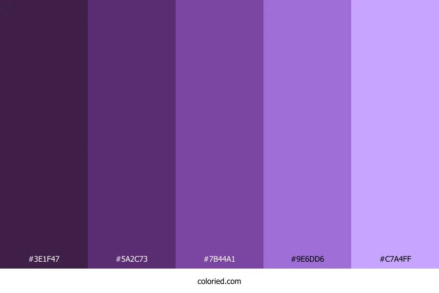 ![]() | #3E1F47 | 62, 31, 71 | 287, 39%, 20% | 13%, 56%, 0%, 72% | oklch(0.300 0.079 318) |