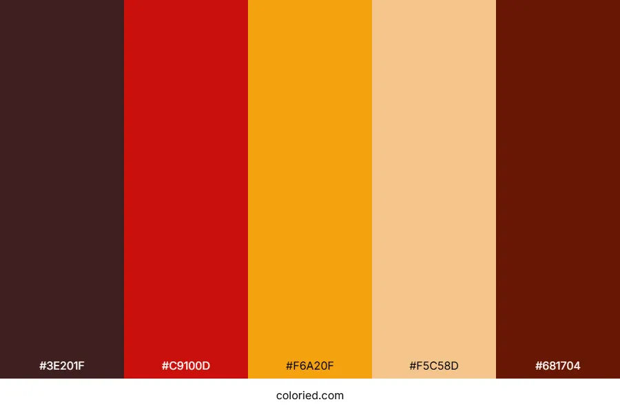 October color palette includes 5 carefully selected colors: dark brown (#3e201f), crimson red (#c9100d), pumpkin orange (#f6a20f), peach (#f5c58d), and dark maroon (#681704).