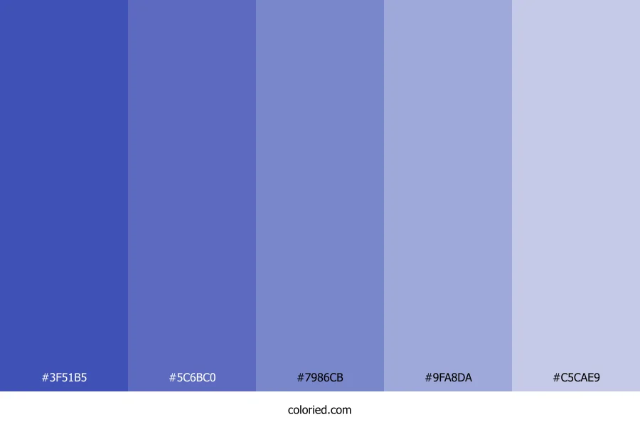 | #5C6BC0 | 92, 107, 192 | 231, 44%, 56% | 52%, 44%, 0%, 25% | oklch(0.556 0.132 274) | |