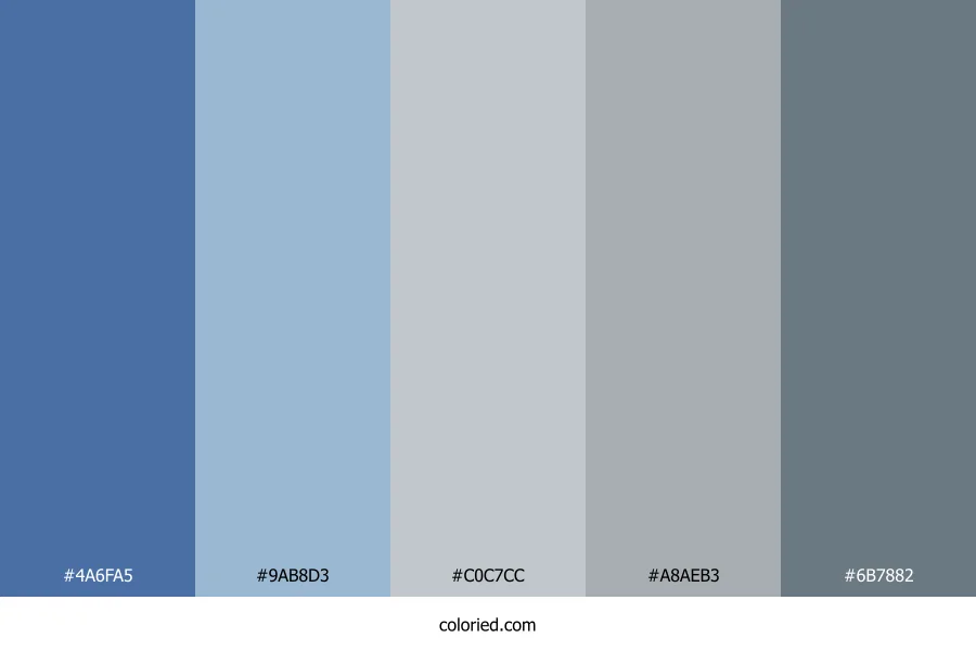 | #9AB8D3 | 154, 184, 211 | 208, 39%, 72% | 27%, 13%, 0%, 17% | oklch(0.769 0.051 246) | |