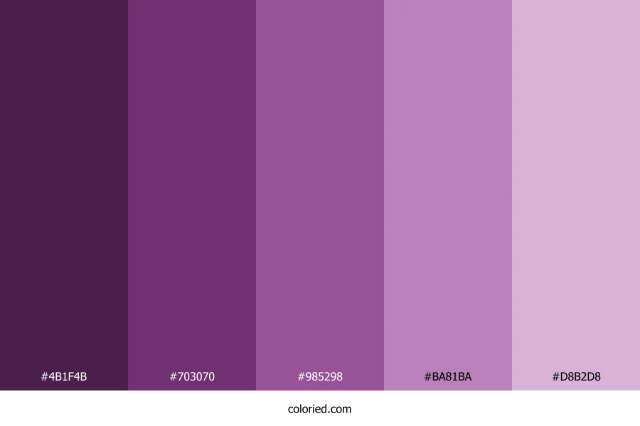 ![]() | #4B1F4B | 75, 31, 75 | 300, 42%, 21% | 0%, 59%, 0%, 71% | oklch(0.322 0.092 327) |