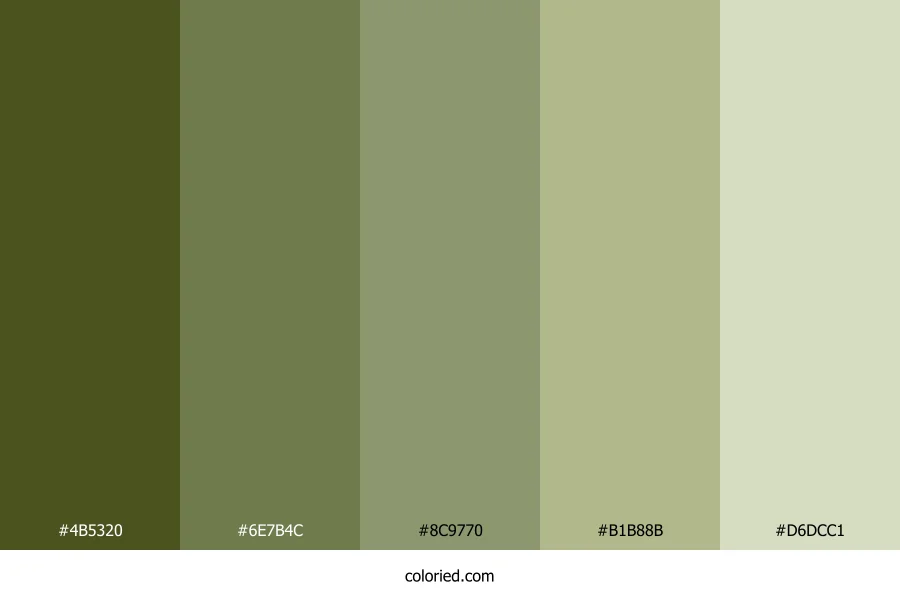 ![]() | #4B5320 | 75, 83, 32 | 69, 44%, 23% | 10%, 0%, 61%, 67% | oklch(0.423 0.074 117) |