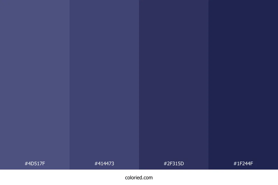 ![]() | #4D517F | 77, 81, 127 | 235, 25%, 40% | 39%, 36%, 0%, 50% | oklch(0.452 0.075 279) |