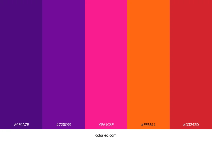 ![]() | #4F0A7E | 79, 10, 126 | 276, 85%, 27% | 37%, 92%, 0%, 51% | oklch(0.346 0.170 305) |