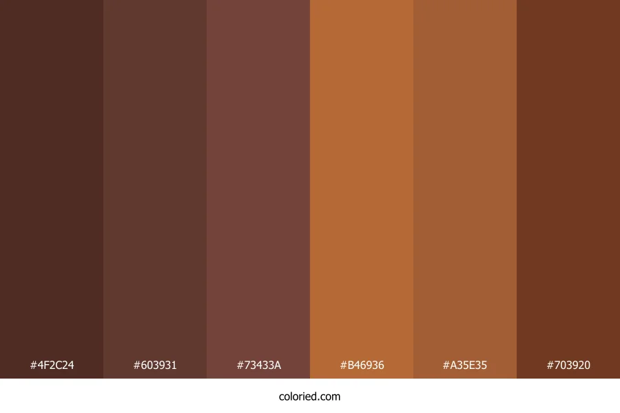 ![]() | #4F2C24 | 79, 44, 36 | 11, 37%, 23% | 0%, 44%, 54%, 69% | oklch(0.336 0.054 34) |