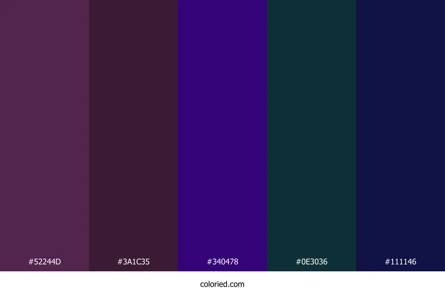 ![]() | #52244D | 82, 36, 77 | 307, 39%, 23% | 0%, 56%, 6%, 68% | oklch(0.341 0.090 332) |