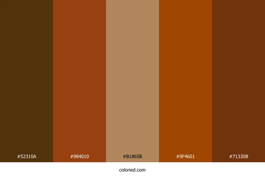 ![]() | #52310A | 82, 49, 10 | 33, 78%, 18% | 0%, 40%, 88%, 68% | oklch(0.347 0.070 65) |