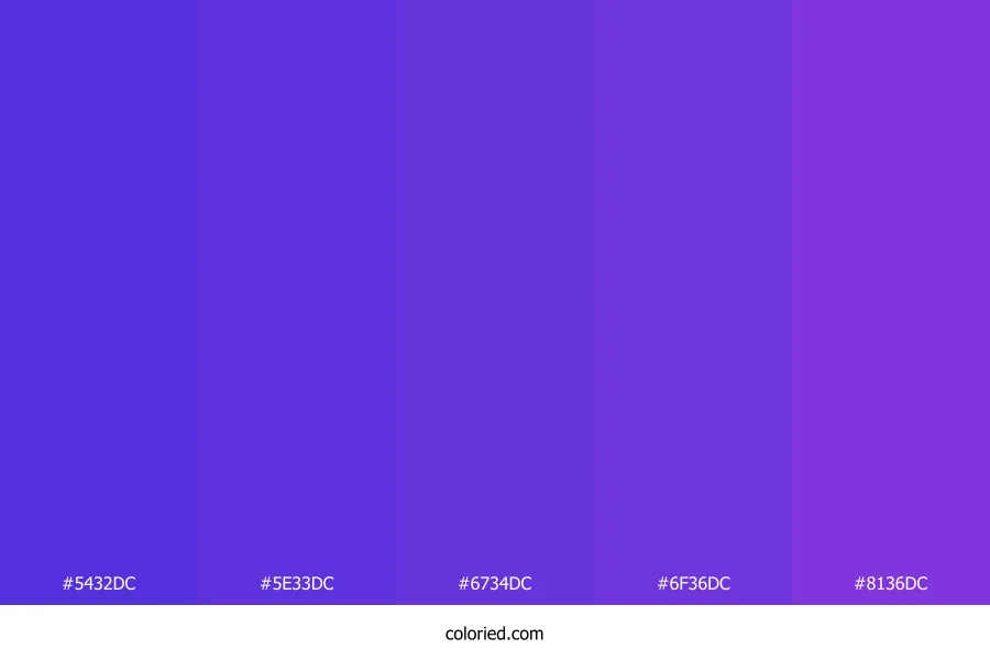 ![]() | #5432DC | 84, 50, 220 | 252, 71%, 53% | 62%, 77%, 0%, 14% | oklch(0.480 0.238 282) |