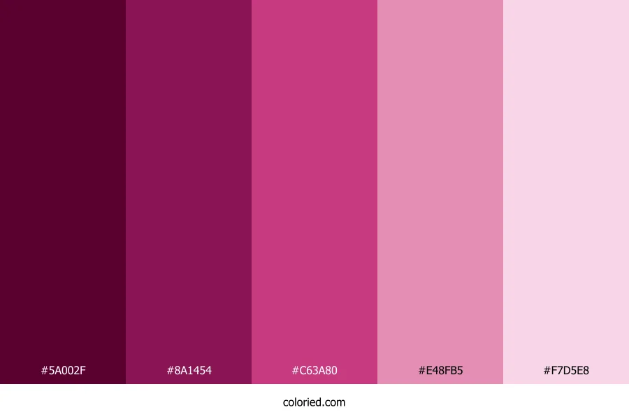 ![]() | #5A002F | 90, 0, 47 | 329, 100%, 18% | 0%, 100%, 48%, 65% | oklch(0.304 0.124 358) |