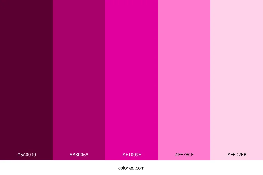 | #E1009E | 225, 0, 158 | 318, 100%, 44% | 0%, 100%, 30%, 12% | oklch(0.604 0.255 347) | |