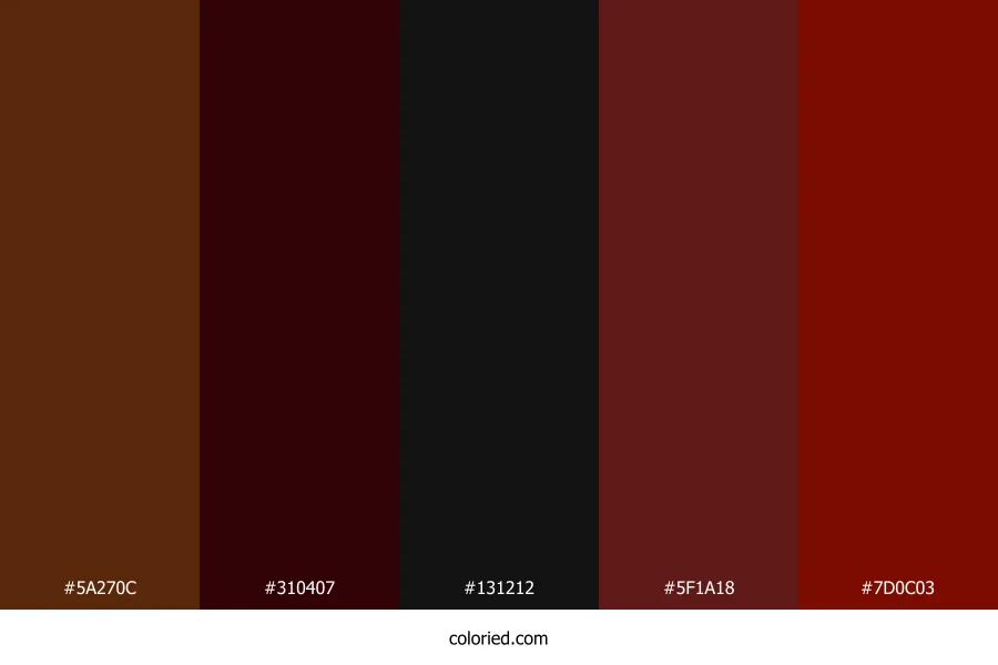 | #5F1A18 | 95, 26, 24 | 2, 60%, 23% | 0%, 73%, 75%, 63% | oklch(0.331 0.101 26) | |