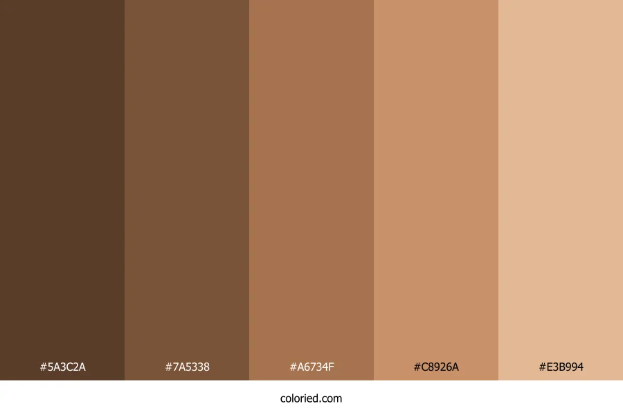 ![]() | #5A3C2A | 90, 60, 42 | 22, 36%, 26% | 0%, 33%, 53%, 65% | oklch(0.386 0.051 52) |