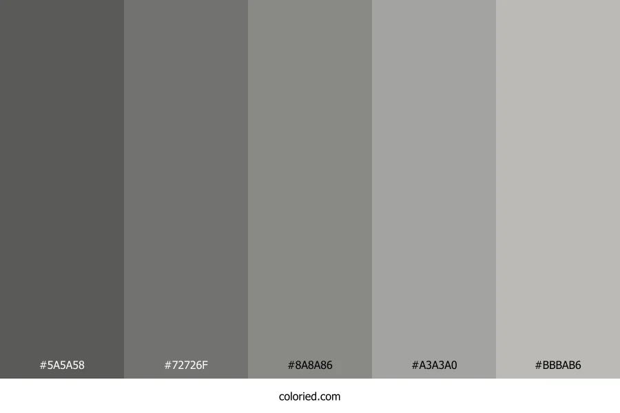 | #8A8A86 | 138, 138, 134 | 60, 2%, 53% | 0%, 0%, 3%, 46% | oklch(0.632 0.006 107) | |