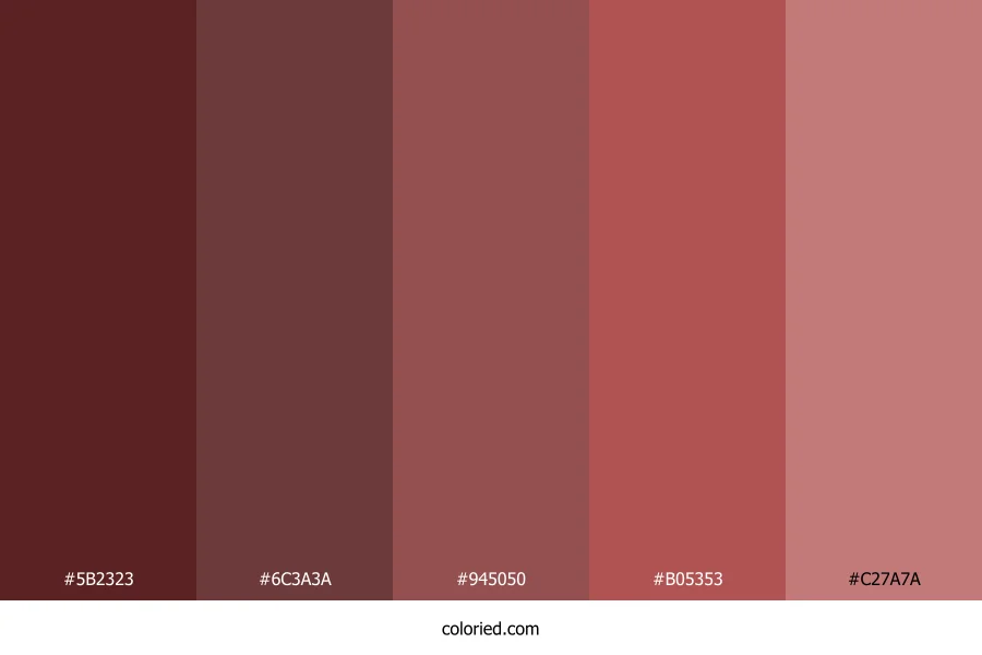 ![]() | #5B2323 | 91, 35, 35 | 0, 44%, 25% | 0%, 62%, 62%, 64% | oklch(0.338 0.083 23) |