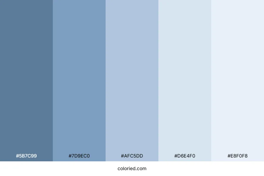 Muted blue color palette includes 5 carefully selected colors: steel blue (#5b7c99), light steel blue (#7d9ec0), powder blue (#afc5dd), alice blue (#d6e4f0), and ghost white (#e8f0f8).
