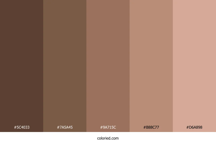 ![]() | #5C4033 | 92, 64, 51 | 19, 29%, 28% | 0%, 30%, 45%, 64% | oklch(0.399 0.045 46) |