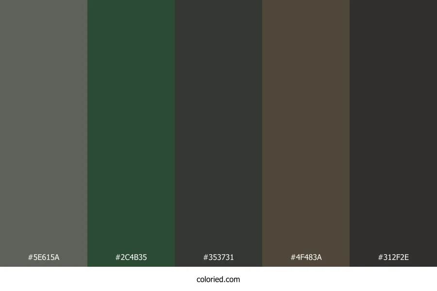 ![]() | #5E615A | 94, 97, 90 | 86, 4%, 37% | 3%, 0%, 7%, 62% | oklch(0.488 0.012 126) |