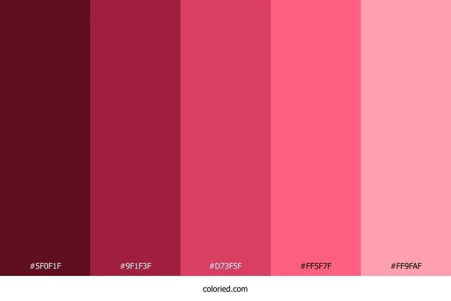 ![]() | #5F0F1F | 95, 15, 31 | 348, 73%, 22% | 0%, 84%, 67%, 63% | oklch(0.320 0.112 16) |