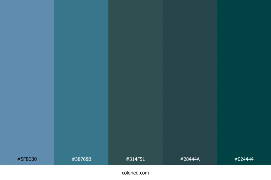 | #024444 | 2, 68, 68 | 180, 94%, 14% | 97%, 0%, 0%, 73% | oklch(0.351 0.059 195) |