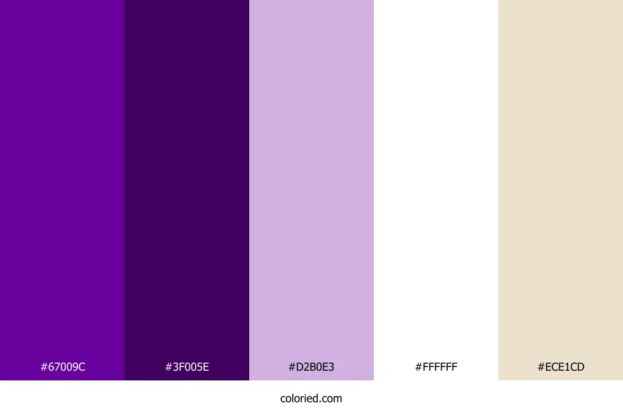 ![]() | #67009C | 103, 0, 156 | 280, 100%, 31% | 34%, 100%, 0%, 39% | oklch(0.404 0.207 307) |
