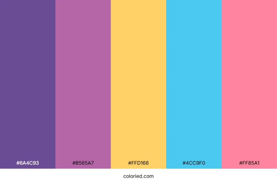 Rarity color palette includes 5 carefully selected colors: royal purple (#6a4c93), orchid (#b565a7), golden yellow (#ffd166), sky blue (#4cc9f0), and candy pink (#ff85a1).