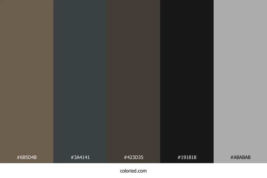 ![]() | #6B5D4B | 107, 93, 75 | 34, 18%, 36% | 0%, 13%, 30%, 58% | oklch(0.487 0.033 74) |