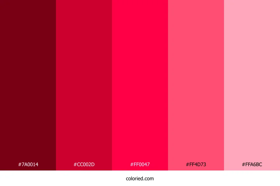 ![]() | #7A0014 | 122, 0, 20 | 350, 100%, 24% | 0%, 100%, 84%, 52% | oklch(0.366 0.148 23) |