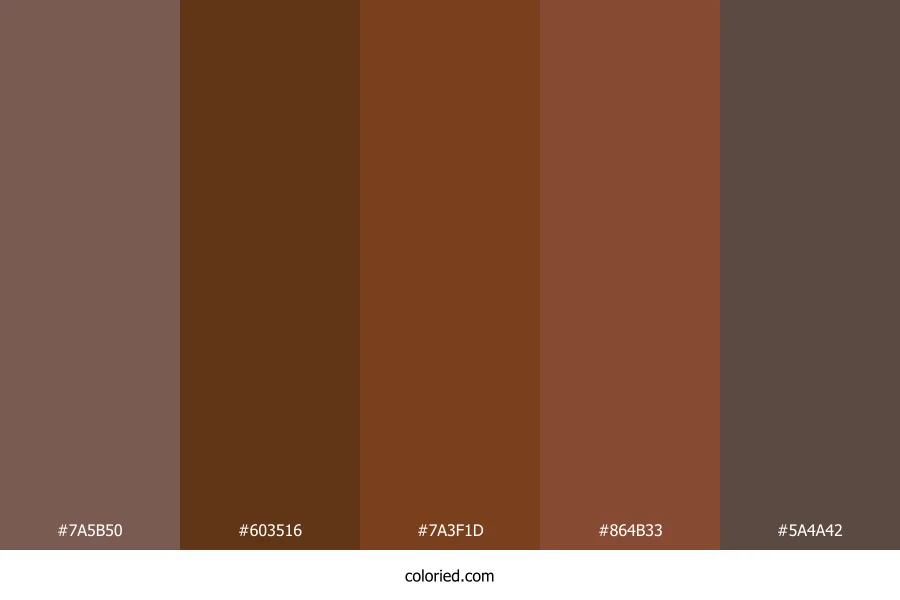 ![]() | #7A5B50 | 122, 91, 80 | 16, 21%, 40% | 0%, 25%, 34%, 52% | oklch(0.500 0.045 40) |