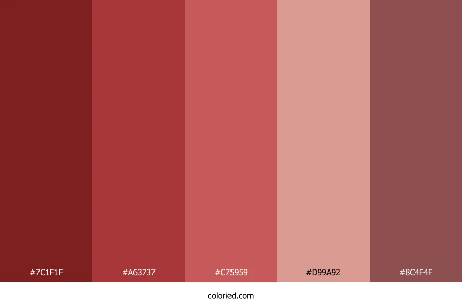 ![]() | #7C1F1F | 124, 31, 31 | 0, 60%, 30% | 0%, 75%, 75%, 51% | oklch(0.393 0.128 25) |