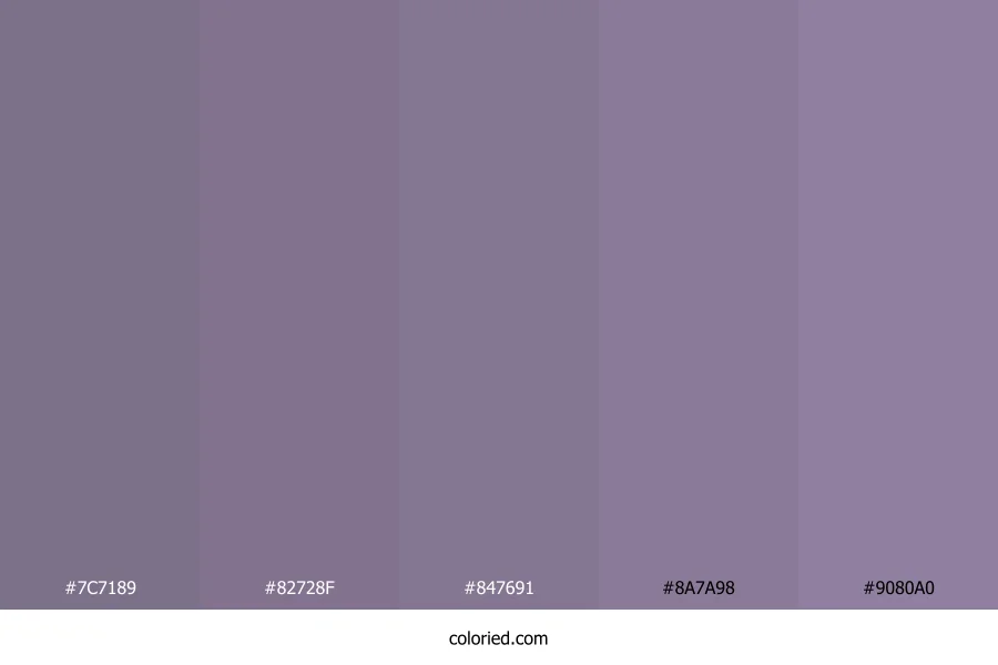 ![]() | #7C7189 | 124, 113, 137 | 268, 10%, 49% | 9%, 18%, 0%, 46% | oklch(0.567 0.039 306) |