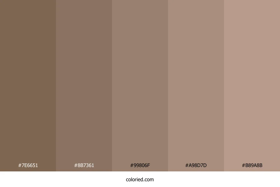 | #8B7361 | 139, 115, 97 | 26, 18%, 46% | 0%, 17%, 30%, 45% | oklch(0.573 0.040 59) | |