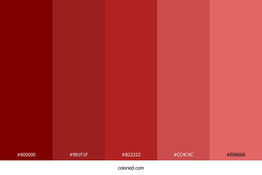 | #B22222 | 178, 34, 34 | 0, 68%, 42% | 0%, 81%, 81%, 30% | oklch(0.497 0.180 27) | |