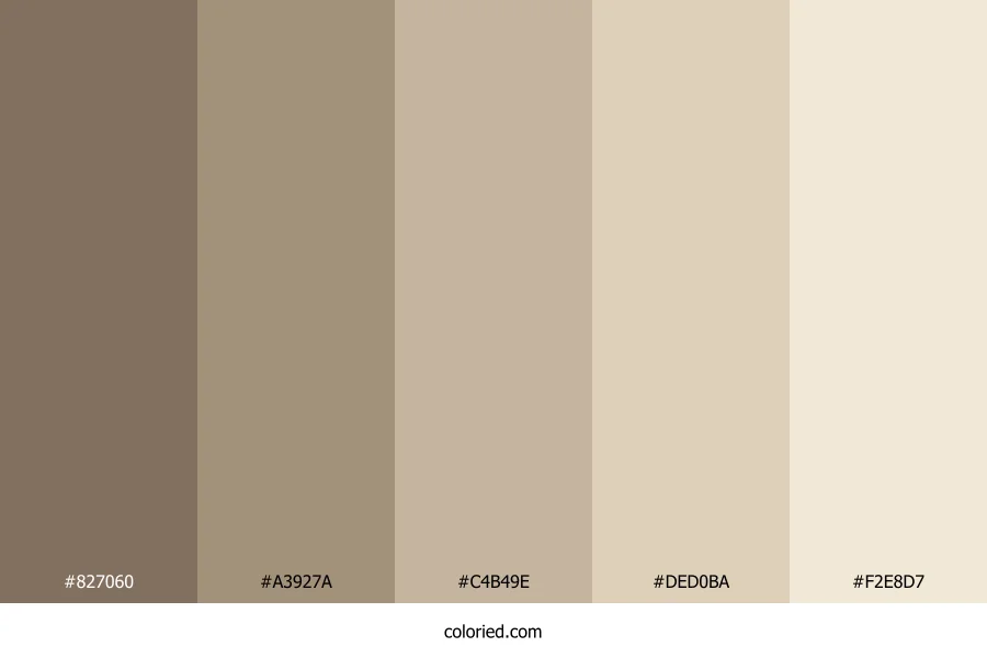 ![]() | #827060 | 130, 112, 96 | 28, 15%, 44% | 0%, 14%, 26%, 49% | oklch(0.558 0.033 64) |