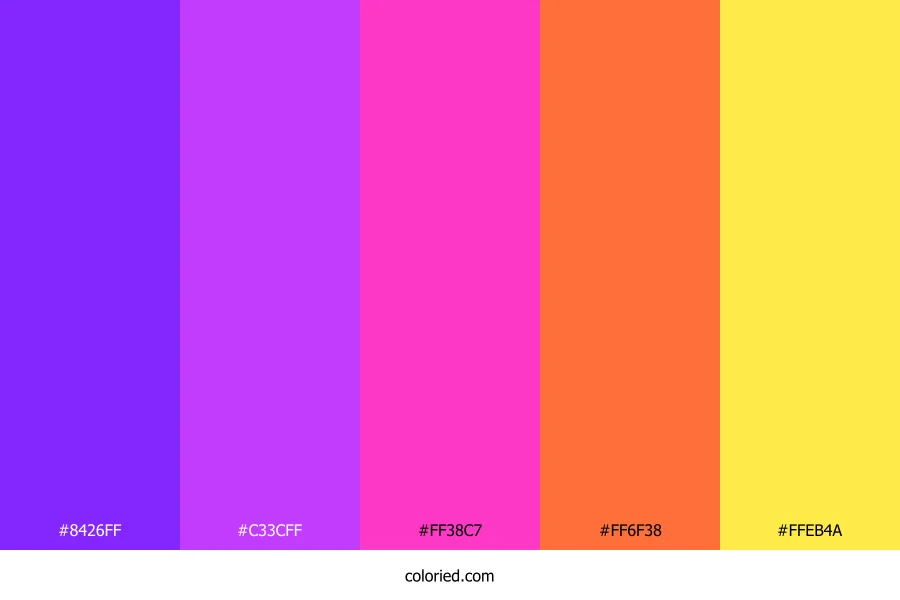 ![]() | #8426FF | 132, 38, 255 | 266, 100%, 57% | 48%, 85%, 0%, 0% | oklch(0.549 0.280 294) |