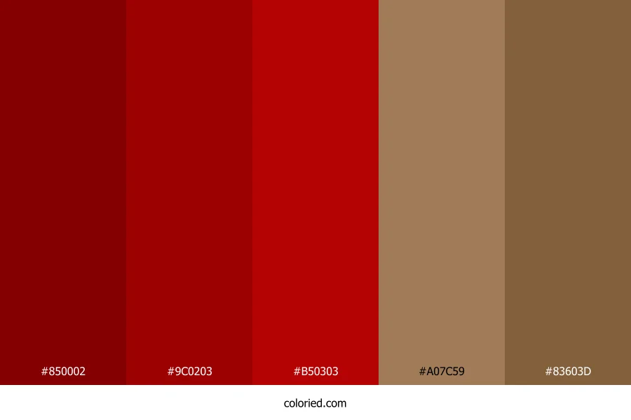 ![]() | #850002 | 133, 0, 2 | 359, 100%, 26% | 0%, 100%, 98%, 48% | oklch(0.387 0.159 29) |