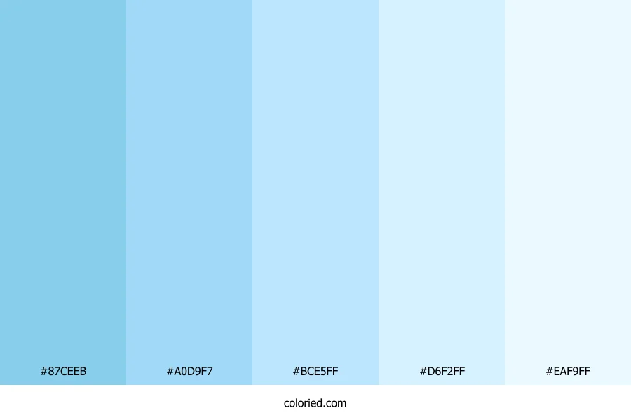 ![]() | #87CEEB | 135, 206, 235 | 197, 71%, 73% | 43%, 12%, 0%, 8% | oklch(0.815 0.082 226) |