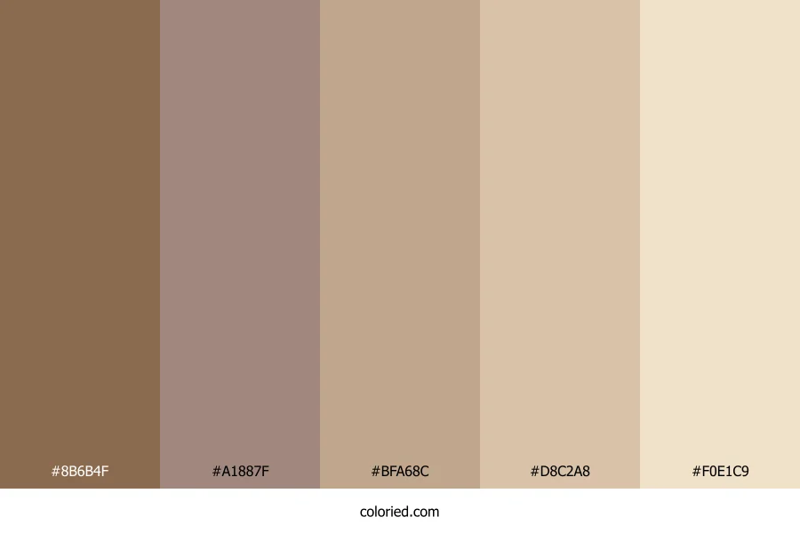 | #BFA68C | 191, 166, 140 | 31, 28%, 65% | 0%, 13%, 27%, 25% | oklch(0.740 0.046 68) | |