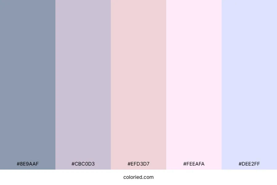 Summer true color palette includes 5 carefully selected colors: cool gray blue (#8e9aaf), soft lavender (#cbc0d3), rose dust (#efd3d7), pale pink (#feeafa), and light periwinkle (#dee2ff).