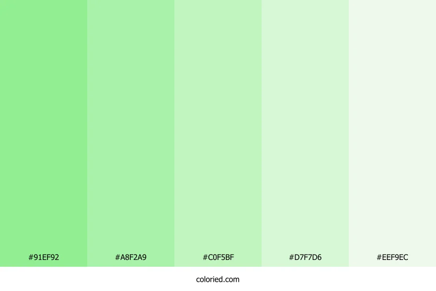 ![]() | #91EF92 | 145, 239, 146 | 121, 75%, 75% | 39%, 0%, 39%, 6% | oklch(0.871 0.155 144) |