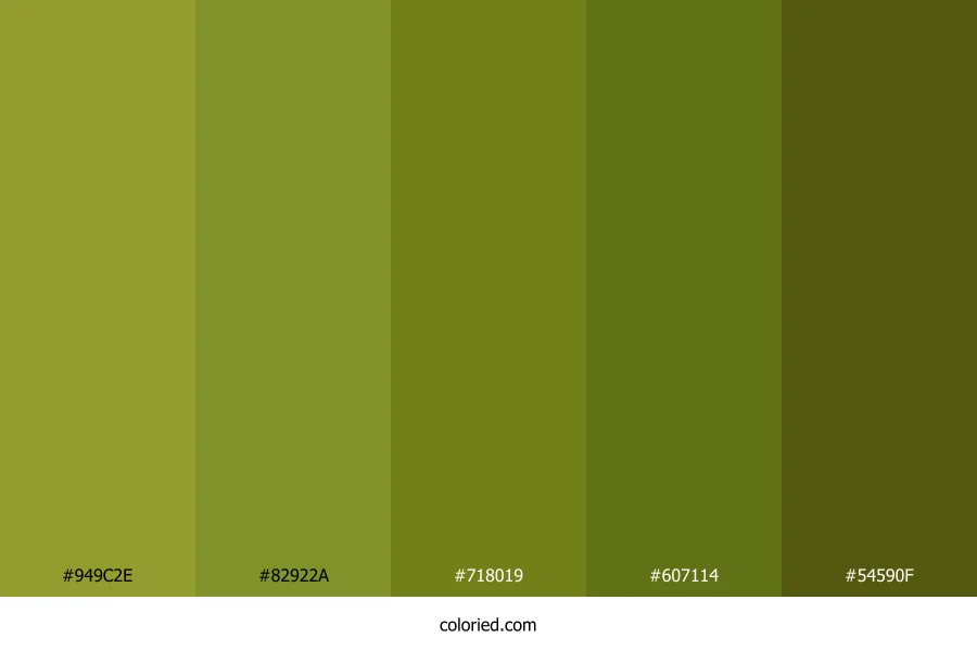 ![]() | #949C2E | 148, 156, 46 | 64, 54%, 40% | 5%, 0%, 71%, 39% | oklch(0.666 0.131 114) |