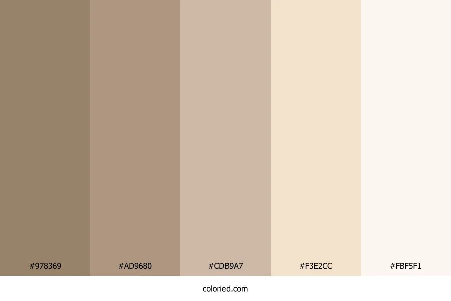 ![]() | #978369 | 151, 131, 105 | 34, 18%, 50% | 0%, 13%, 30%, 41% | oklch(0.621 0.045 74) |