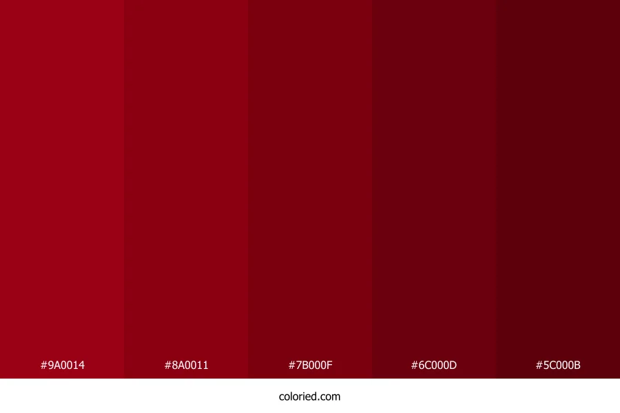 ![]() | #9A0014 | 154, 0, 20 | 352, 100%, 30% | 0%, 100%, 87%, 40% | oklch(0.432 0.175 25) |